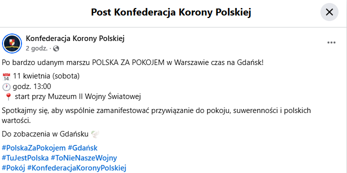 Konfederacja Korony Polskiej ogłosiła, iż organizowany przez tę partię „Marsz za Pokojem” wyruszy z placu Władysława Bartoszewskiego, na którym stoi pomnik rtm. Witolda Pileckiego.